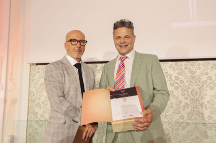 Robert Laabmayr, Geschäftsführer der LINK3 GmbH (rechts), freut sich über Platz 2 in der Kategorie Innovation des Wikarus. Laudator war Martin Hagenstein, Geschäftsführer der Salzburger Nachrichten (links).